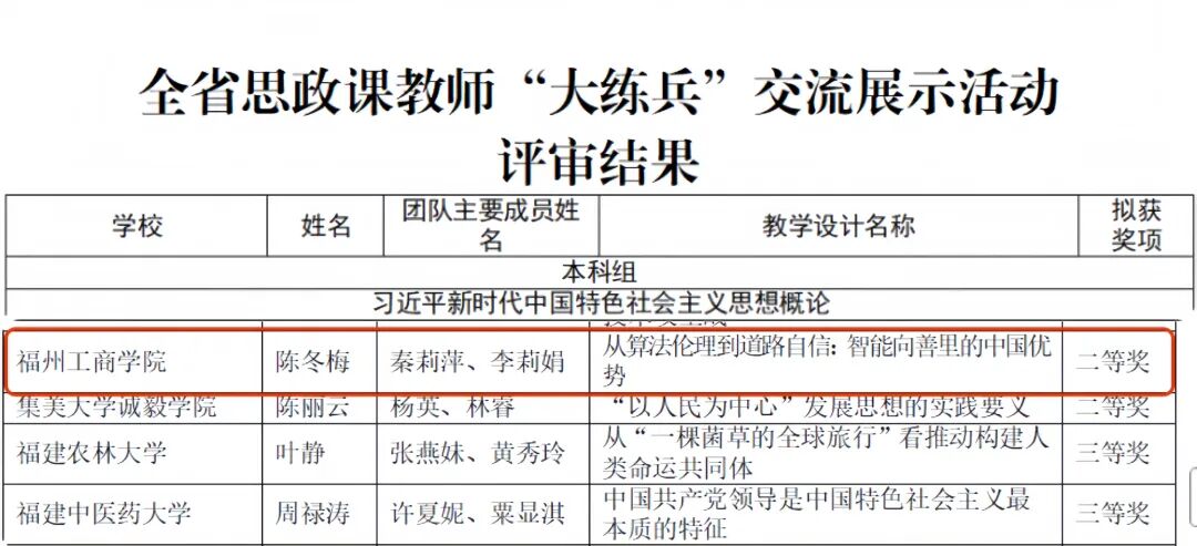 3.陈冬梅、秦莉萍、李莉娟老师获福建省思政课教师“大练兵”交流展示活动《习近平新时代中国特色社会主义思想概论》课程本科组二等奖。