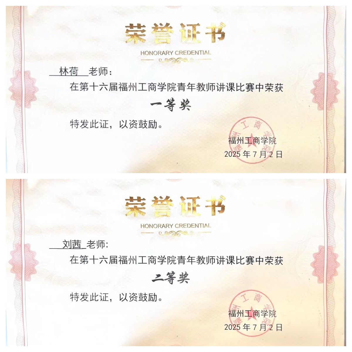 8. 林荷老师、刘茜老师分别获得学校第十六届“青年教师教学比赛”一等奖和二等奖。