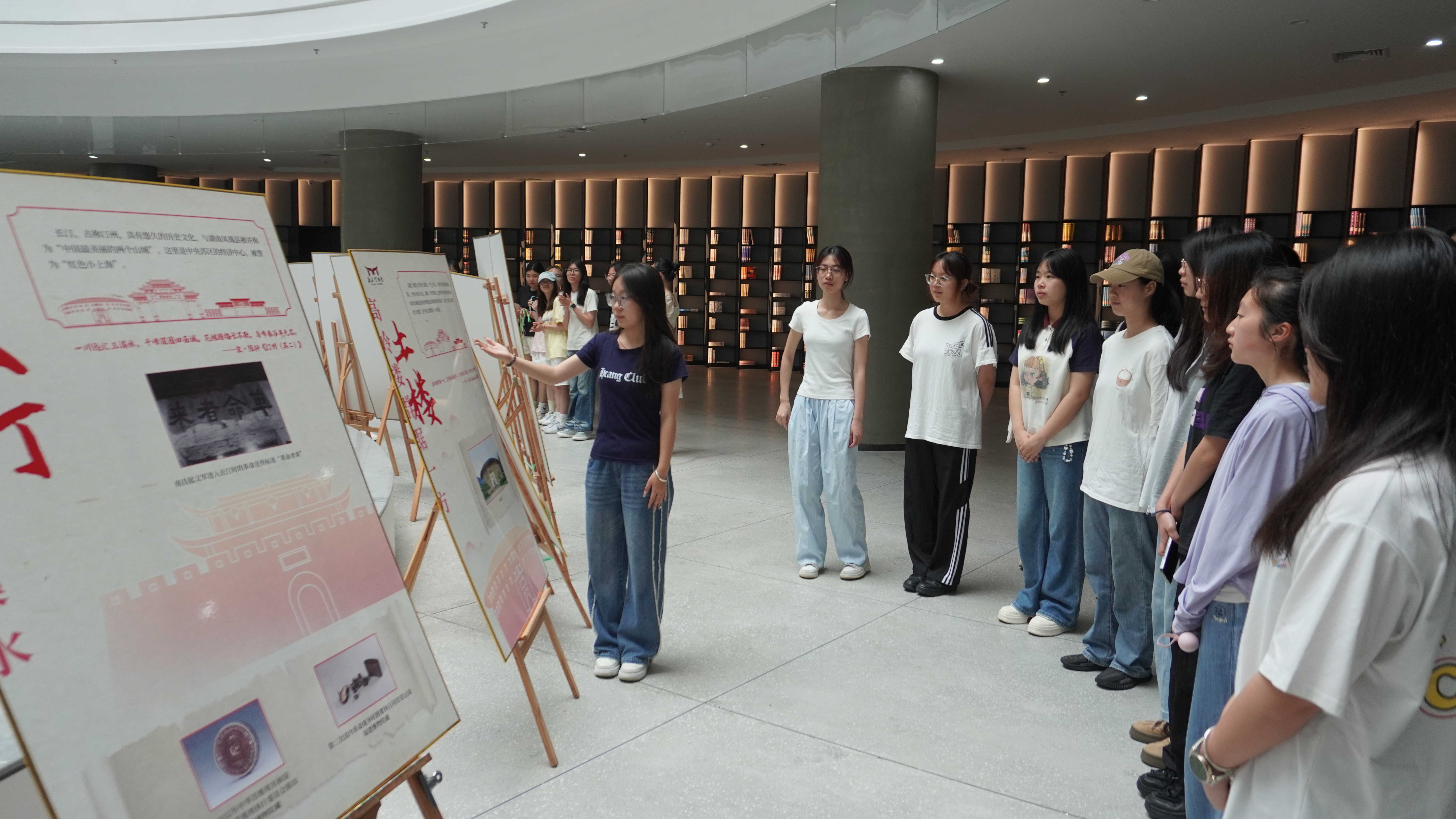 图书馆一楼独具匠心的同心圆区域与“跟着诗词游福建“系列图片展板相得益彰,成为展示福建特色文化的精彩场地,精心挑选的50块展板错落有致地分布在同心圆区域内,仿佛是50位文化使者,静静地诉说着福建的故事。每一块展板都经过精心设计,图文并茂,将福建的山水、人文、历史等特色文化元素巧妙融合。